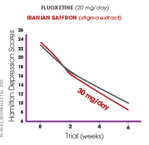 Safran etkinliğinin , herhangi bir yan etki olmaksızın bu bozuklukları tedavi etmek için kullanılan iki ana farmasötik ilaç olan FLUOXETINE veya IMIPRAMINE ile istatistiksel olarak aynı olduğu gösterilmiştir .